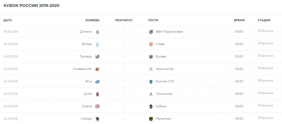 1/8 финала Кубка России (мужчины) проходит с 24 по 27 мая 2019 года