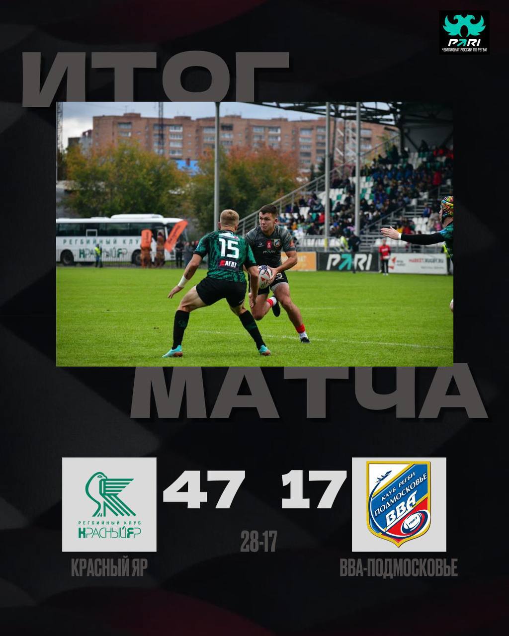 В рамках 14-го тура PARI Чемпионата России по регби «ВВА-Подмосковье» на своём поле примет красноярский «Енисей-СТМ».    Это заключительный матч регулярки, дальше - плей-офф! Приходите поддержать команду на трибунах — ваша поддержка очень важна для ребят ♥️ Давайте создадим на трибунах атмосферу, которая зарядит команду энергией и духом борьбы.   Ждем всех болельщиков 20 сентября в 12:30 по адресу: р.п. Монино, ул. Авиационная, 2Г.   Возьмите с собой хорошее настроение и громкие голоса. Будем болеть вместе!   Знакомимся с составом «ВВА-Подмосковье»    Основной состав:   1. Агеев Александр 2. Червяков Вячеслав 3. Собачкин Кирилл 4. Кравцов Иван 5. Арлашов Никита 6. Мысин Сергей 7. Жлутков Михаил 8. Панарин Кирилл (к) 9. Казаков Александр 10. Кулешов Егор 11. Бабаев Илья 12. Давыдов Александр 13. Мотов Сергей 14. Шмелев Станислав 15. Крылаткин Даниил   Запасные: 16.Сиделев Дмитрий 17. Скобиола Алексей 18. Кузнецов Виктор 19. Огородник Дмитрий 20. Бабаев Михаил 21. Суханов Александр 22. Шаповалов Илья 23.Дрождин Дмитрий   До встречи на стадионе!