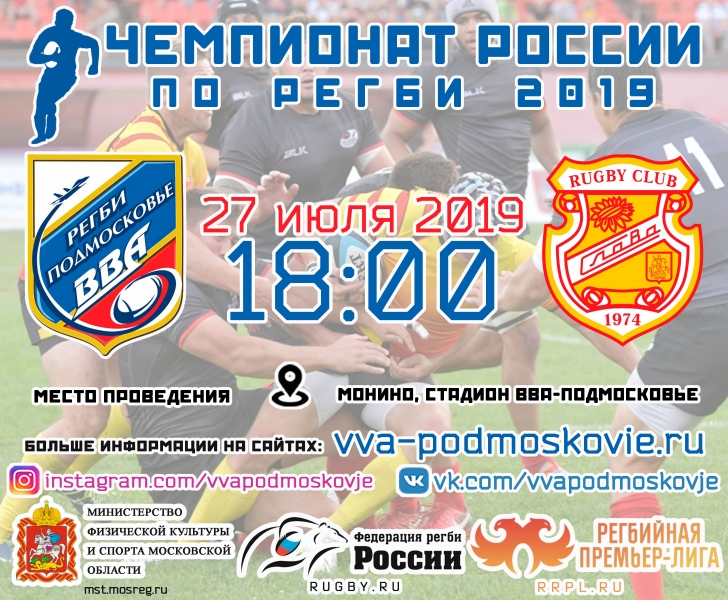 27 июля, в рамках Чемпионата России по регби 2019 года, состоится игра между командой «ВВА-Подмосковье» и РК «Слава» (г. Москва).