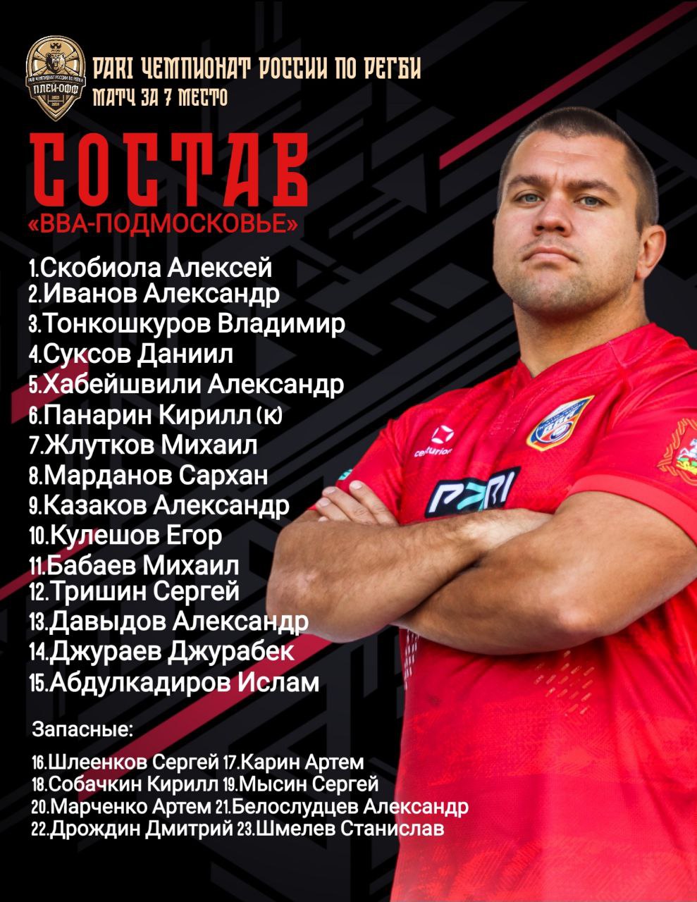 ?Тренерский штаб регбийного клуба «ВВА-Подмосковье» определил состав команды на завтрашний матч PARI Чемпионата России по регби за 7 место против московской команды «Слава»: