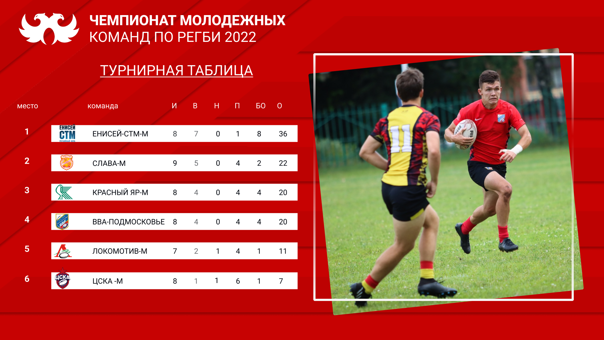 Турнирная таблица Чемпионата молодежных команд по регби. "ВВА-Подмосковье-М" на четвертом месте. Завтра, 22 сентября в 16:00 в Монино на домашнем стадионе состоится матч 8 тура, где военлеты встретятся с командой "Енисей-СТМ-М".