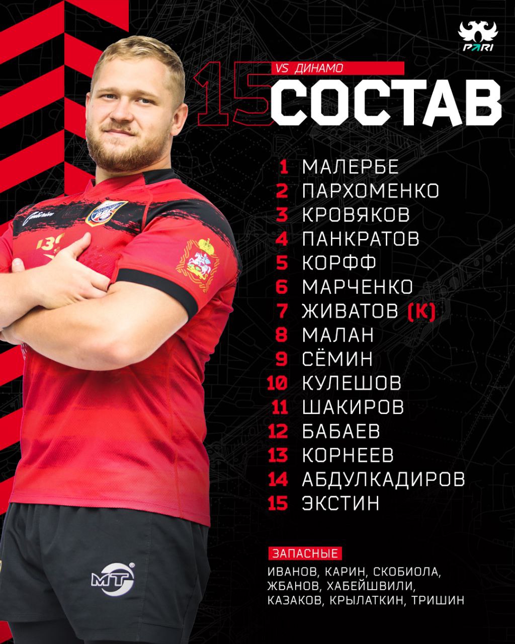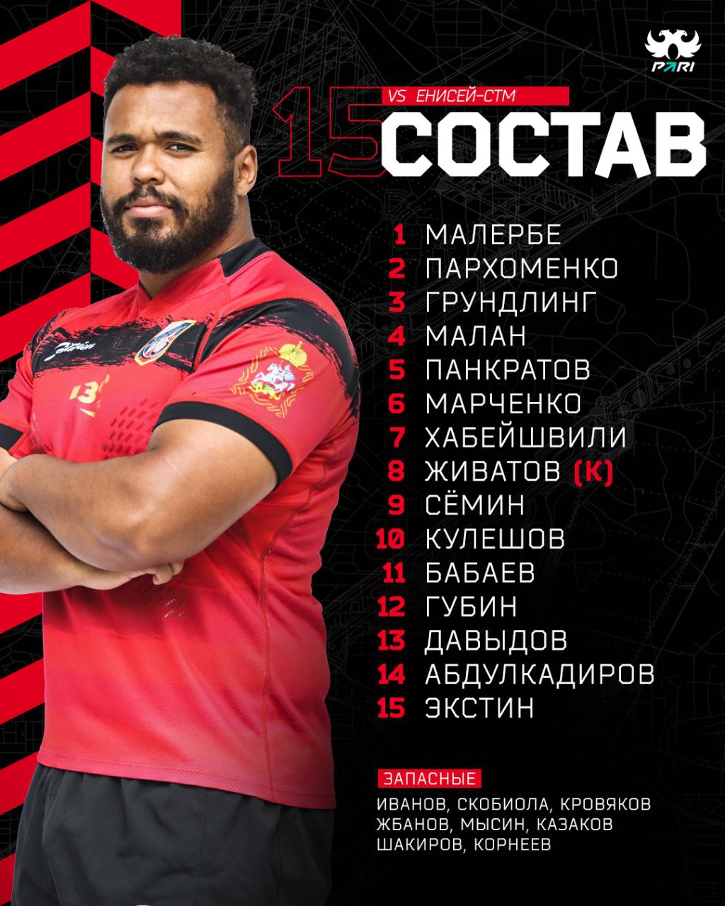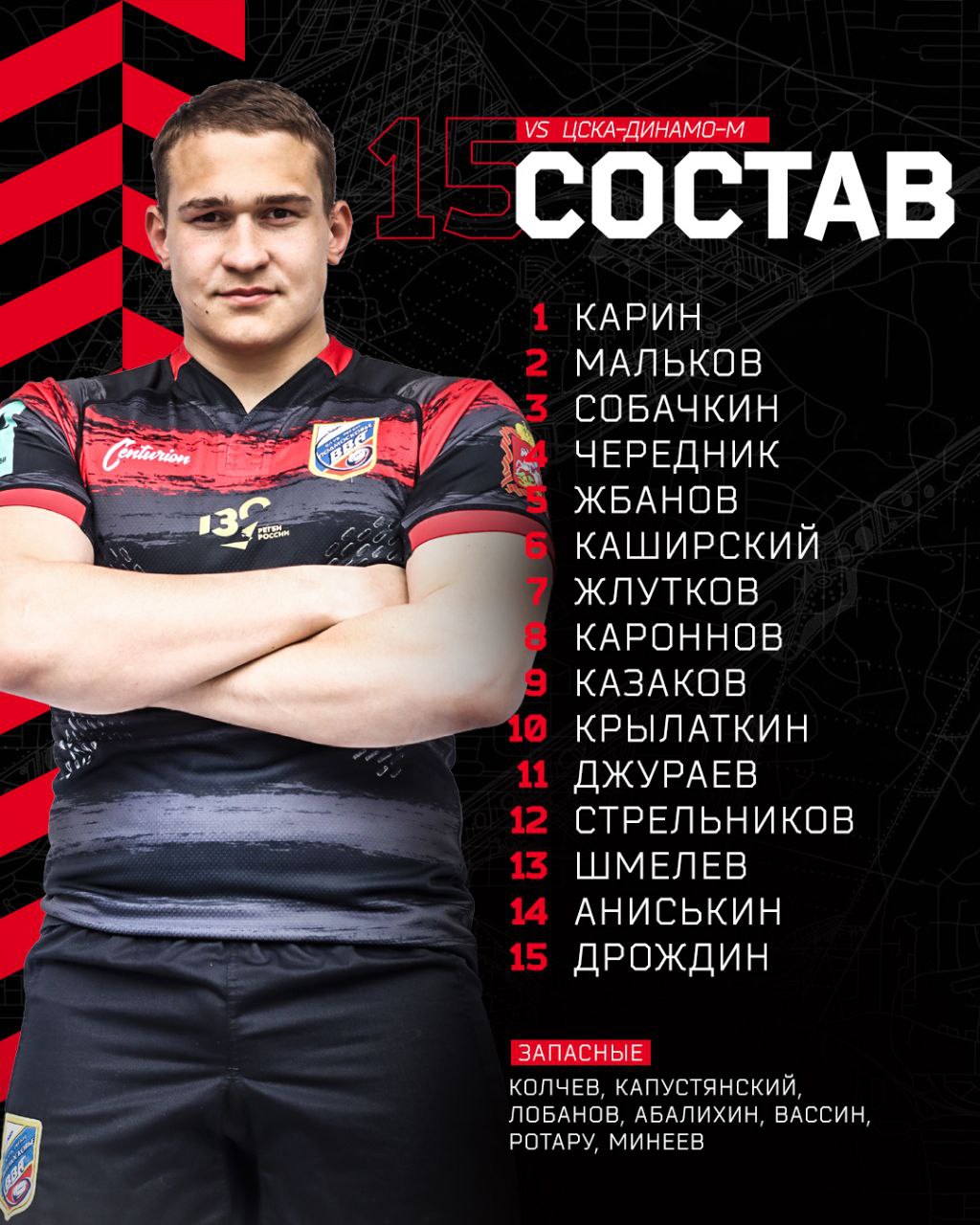 Публикуем состав команды «ВВА-Подмосковье» на матч против красноярского регбийного клуба «Енисей-СТМ», который пройдет 4 июня на домашнем стадионе в Монино ул Алксниса 42 .