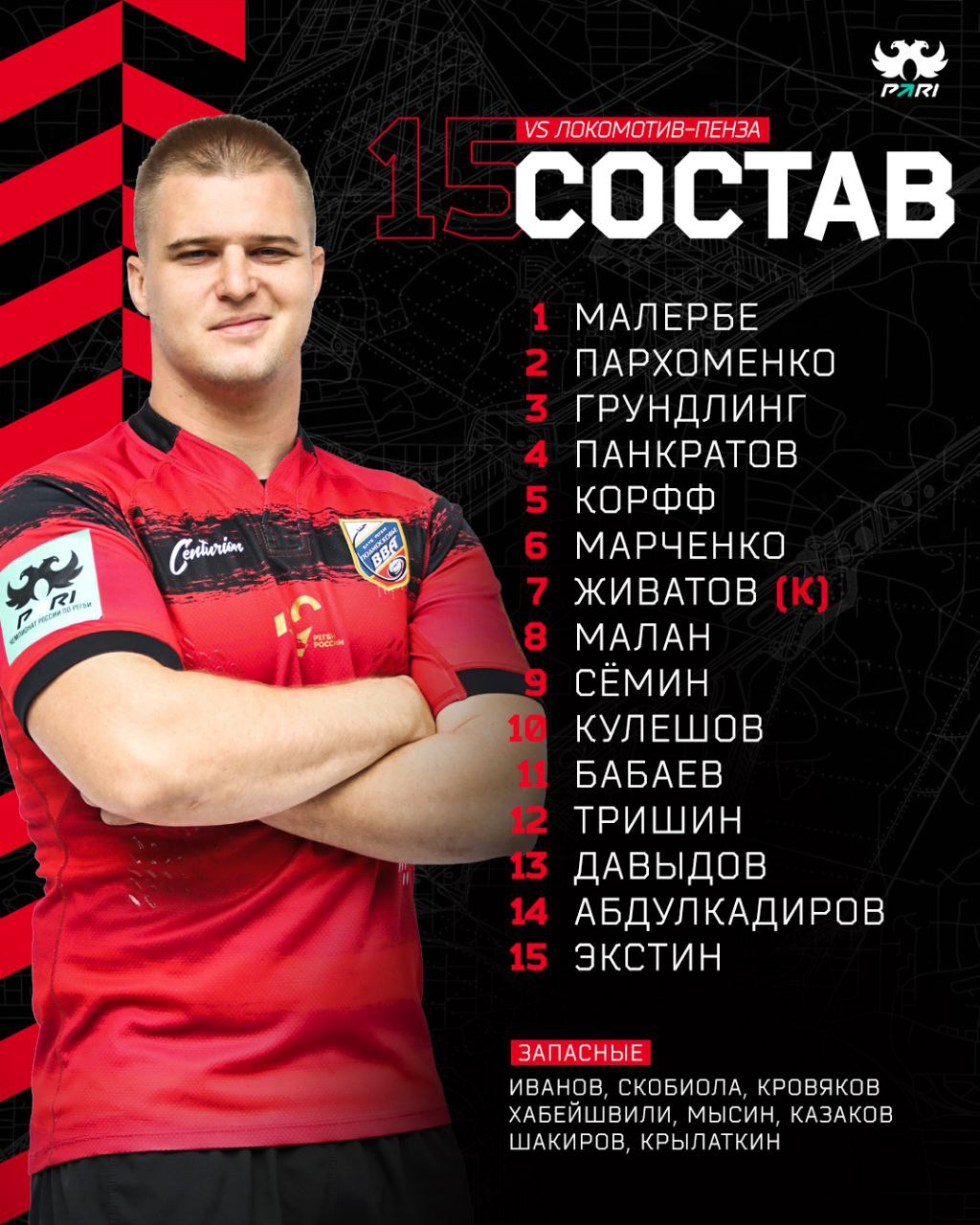 Публикуем состав команды  «ВВА-Подмосковье» на матч против московского регбийного клуба  «Слава», который пройдет в г. Москва, улица Селезневская 13А.