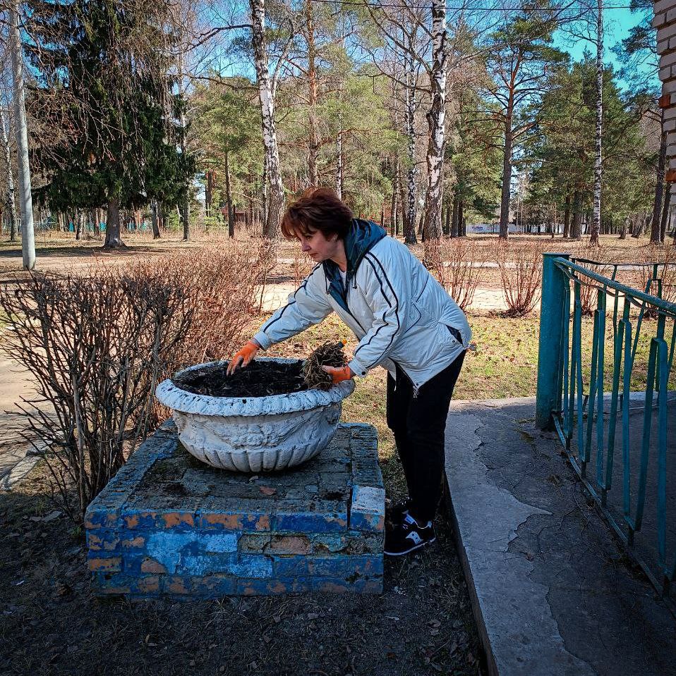 Спортсмены с тренерами провели уборку газонов от листвы и прошлогодней травы, подстригли кустарники. А женская часть коллектива  навела порядок на клумбах и высадила цветы в вазонах.